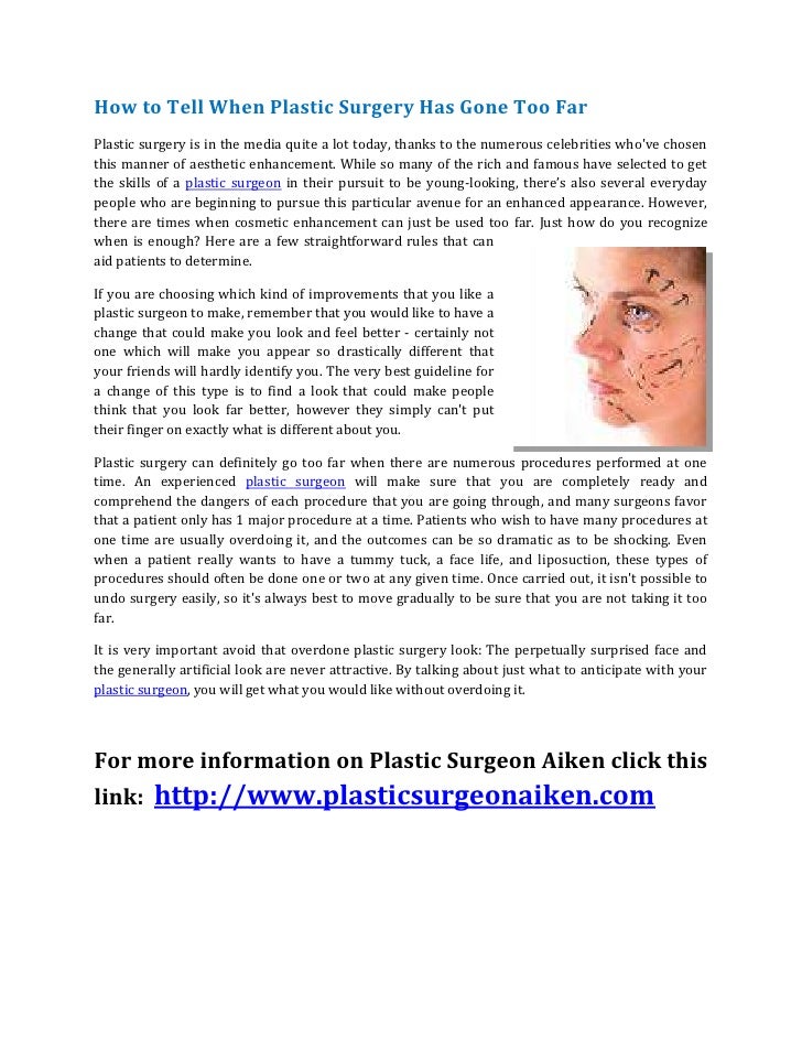 However, when cosmetic surgery is overdone, it may so we're programmed to say to somebody who has had plastic surgery, you look great. nobody likes to be told they've gone too far, & the plastic.
